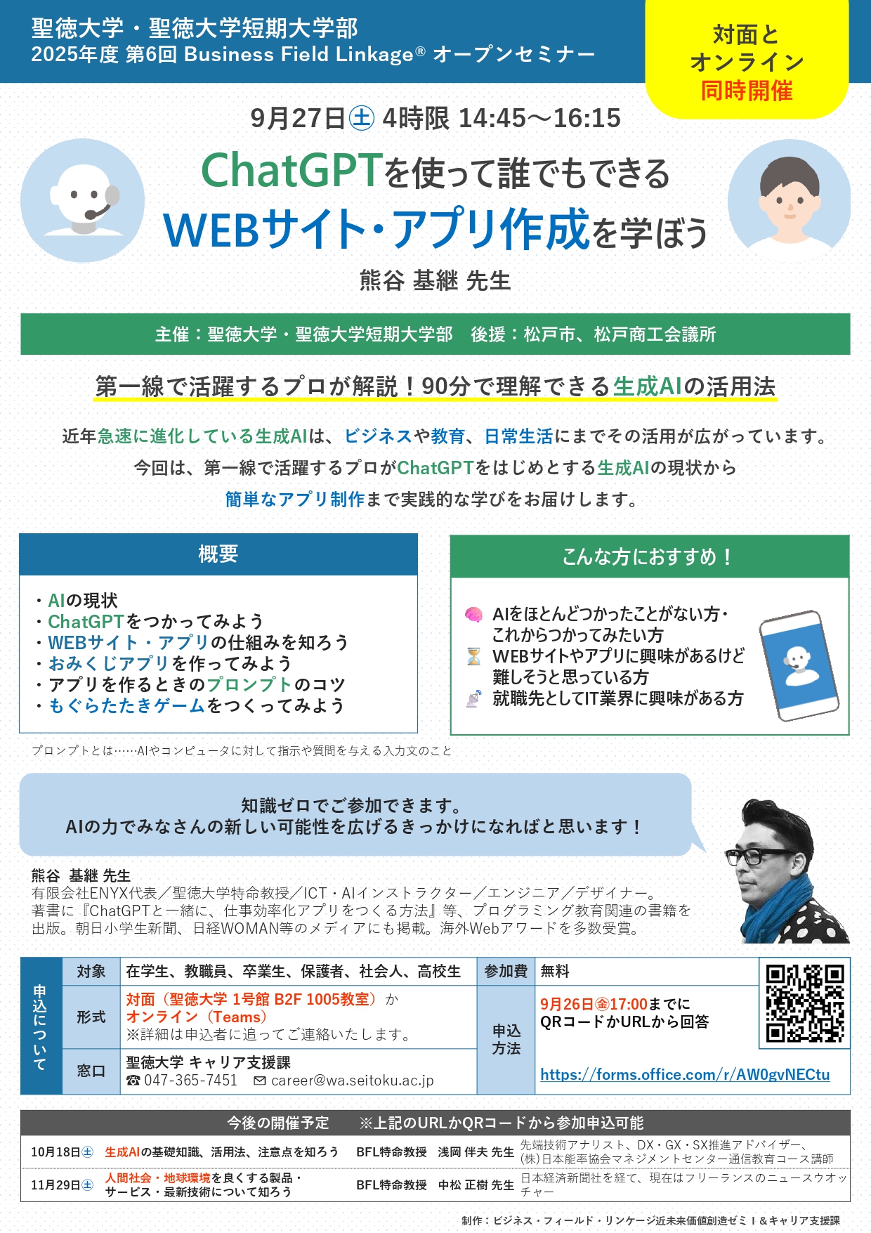 9月27日(土)、2025年度第6回Business Field Linkage®オープンラボミニセミナーを開催しました。当日の様子がJ:COMチャンネルにて放送されます。ぜひご覧ください。