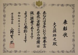 10月24日(金)、人間栄養学科 大久保 研之教授が多年にわたり栄養改善に尽力し、その功績が特に顕著であることから令和7年度栄養関係功労者厚生労働大臣表彰(栄養士養成功労者)を受賞いたしました。