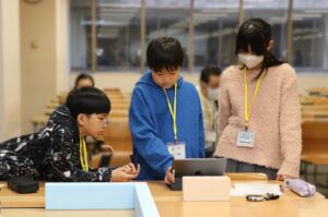 グループごとにタブレットを使用して、車型ロボットの動きを考えながらプログラミングを構成し、ロボットを動かすことに挑戦しました。