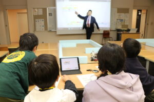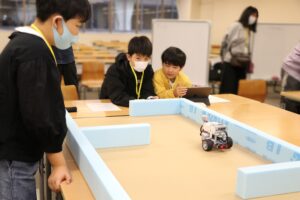 グループごとにタブレットを使用して、車型ロボットの動きを考えながらプログラミングを構成し、ロボットを動かすことに挑戦しました。
