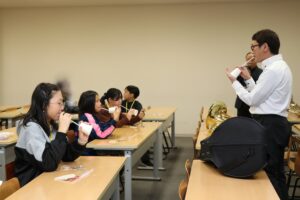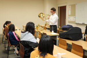 ホルンの音を直に聞き、金管楽器の音の出る仕組みについてストローや紙コップを使い工作を通して体験しました。