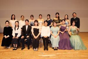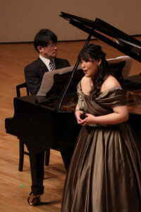 第2部は学生と日本を代表するバリトン歌手である青戸知先生による重唱によるオペラ作品で幕を開けます。山本愛音さん(大学1年)歌劇《フィガロの結婚》より、三寺由夏さん(大学2年)歌劇《コジ・ファン・トゥッテ》より。どちらの演目も個性的なキャラクターを演じなければなりません。青戸先生のリードも見事で、学生2名も演じ切り、惜しみない拍手が贈られました。続いて上荒磯佐和さん(博士前期課程2年)G. ヴェルディ:歌劇《イル・トロヴァトーレ》等グランドオペラの傑作を披露し、会場は興奮に包まれました。