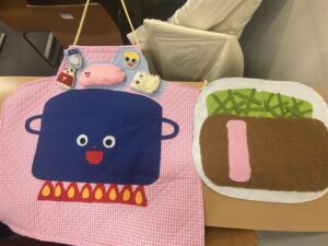 エプロンシアターとは、エプロンを舞台にして、人形をマジックテープなどで貼り付けて動かし、物語を伝える人形劇のことです。学生たちは「美味しいとんかつが出来るまで」を演目にエプロンシアターを行い、エプロンのポケットからさまざまな人形が飛び出すと子供たちからは歓声が上がっていました。