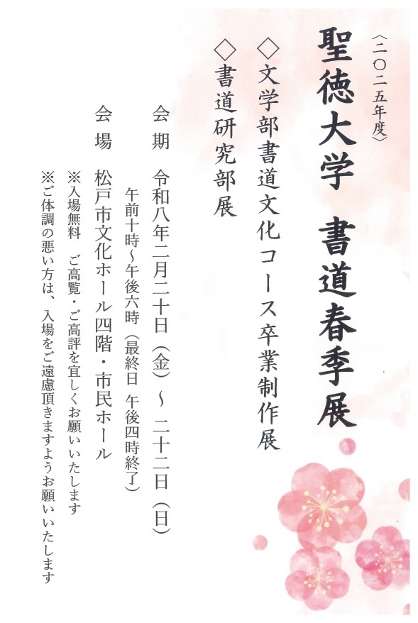 2月20日(金)から22日(日)まで、松戸市文化ホールにて、学生たちが活動成果発表の場として「聖徳大学書道春季展」を開催します。この展覧会は、文学部文学科書道文化コース4年生が「卒業制作展」を、書道研究部の1~3年生が活動成果として「書道研究部展」で構成されます。