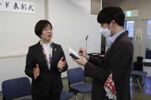 社会福祉学科の池田静香教授(左)が取材を受ける様子