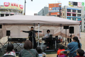 当日は雨模様となり開催が心配されましたが、演奏が始まる頃には雨も上がり、子どもからご年配の方まで、多くの方が足を止めて演奏に耳を傾けてくださいました。お客さまから好きな「音階」を募集し、それを大学院生がその場で組み合わせて即興演奏を行う場面もあり、音楽を通して会場がひとつになり、終始あたたかな雰囲気に包まれたイベントとなりました。
