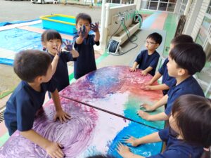 夏休みに入りましたが、幼稚園では預かり保育を利用する園児が登園してきて元気いっぱい遊んでいます。保育後の預かり保育とは違い、夏休みの預かり保育は夏ならではの遊びが楽しめるよう、活動内容を工夫しています。また、異年齢の幼児との関わりも増え、年長・年中の幼児が年少・満3歳児の面倒を見たり、低年齢の幼児はお兄さんお姉さんの真似をして遊ぶ等、一人ひとりの成長につながっている様子もうかがえます。