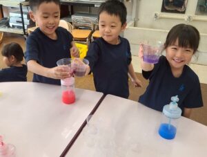 連日の猛暑対策としてプールの上にタープテントを張り、更に日除けのシートも付け、短時間ではありますが水遊びをしています。また、その他に色水あそびをしました。赤・青・黄色の中から好きな色を選んで透明のカップに入れると、色が混ざり色が変化することを楽しんでいました。「オレンジジュースが出来たよ」「なんか、不思議な色になった・・・」「全部(の色)入れちゃった!!」と、色水を入れたカップを友だちや先生に見せ、色の変化に興味を示していました。他にも魚を作って魚釣り遊びをしたり、友だちと折り方を教え合いながら折り紙をしたり、動物やキャラクターの絵を描いて棒をつけペープサートを作る等の製作あそびも楽しんでいます。