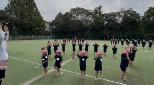 ・遊戯「SEITOKUよさこい」は運動会当日は鳴子を持って踊ります。踊りの方向を揃えるために、全員自分のマーカーを持ちます。右手は「水色」、左手は「ピンク」を持ち、特訓中。左右の手を覚えるいいチャンスにもなりそうです。