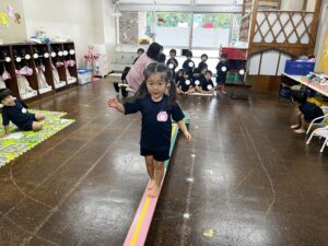 ・「うさぎ」になってラバーリングを跳んだり、10cmの高さの巧技台に跳び乗って、幅10cm一本橋渡りをしたりしています。