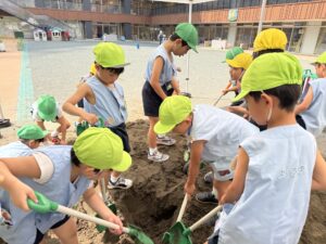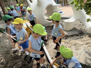 夏休みの終わりに、トラックで大量の砂が砂場横に運搬されました。始業式の日に登園してきた幼児は、「あれ?砂の山ができているよ。どうして?」と不思議がっていました。「先生、いつになったら遊べるの?」と心がわくわくです。砂場環境を整え、幼児たちが「山の上から水を流そう」「トンネルつくろうよ」とやりたいことが飛び交います。砂がさらさらで思ったように形にならないと、「水で砂をぬらさないとだめだよ」「バケツに水を入れて持ってきて」とバケツリレーがはじまりました。友達と協力し、助け合いながら遊びが発展していく様子や疑問が生じた時には、試行錯誤しながら砂の性質に興味・関心をもち、様々な探究を深堀できるように教師も関わっていきます。そして幼児たちの言葉に耳を傾けて、問いかけを大切に研究を進めていきます。
