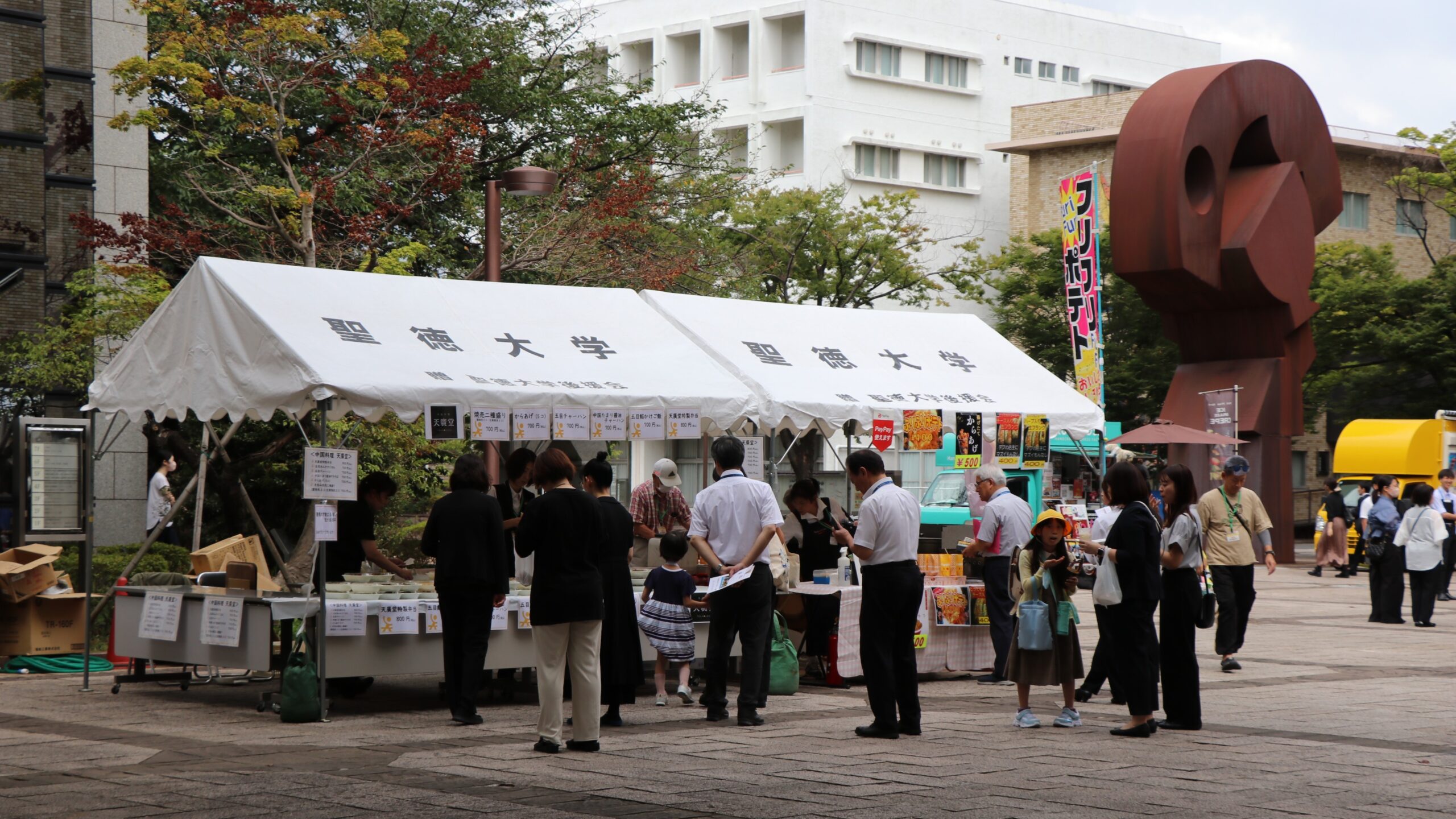 当日のプログラムは、5年ぶりに復活した吹奏楽研究会によるウエルカムコンサートから始まり、北海道研修・海外研修想い出の部屋、歴代の制服の展示といった音楽や展示による感動体験がありました。業種別ネットワークの集まり、学友会の同窓会、クラス会の開催、香和会によるカフェの開催、キッチンカー集合と多くの場所で交流を深める姿がにぎわいをもたらしてくれました。初めて学生とともに開発した大学オリジナル周年記念グッズ販売には、長い行列ができたほどでした。