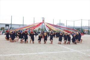 5歳児年長まつ組のマスゲームは「遊園地」をテーマに表現をしました。また今年度は「メイポール」を使い、鮮やかな色のリボンを使って友だちと気持ちを合わせ自己表現をしました。活動に取り組む中で上手くリボンが編み込めない日もありました。しかし、「どうしてこうなってしまったのか」「なぜうまくできなかったのか」を先生や友だちと一緒に考え、時には撮影した映像をみんなで見て振り返るなどして当日まで協力し合いながら取り組んでまいりました。少しずつ取り組んでいるうちに子どもたち同士で声を掛け合う、言葉を交わし合う、困っている友だちを助けようとする姿もたくさん見られるようになり、協調性が育まれてきました。運動会当日では、子どもたち一人ひとりが大きな声を出し合いカウントを取りながら曲に合わせリボンを色鮮やかに綺麗に編みこむことが出来、たくさんの拍手をもらうことで達成感を味わう経験となりました。