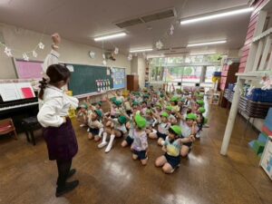 4歳児梅組の遊戯「ひょっこりひょうたん島」は大運動会でも披露しましたが、今回並び方や踊る向きなどをステージ用に変更し、再構成された遊戯を披露しました。舞台で目印となるラインやマークを第二幼稚園の遊戯室で再現し、本番と同じ環境で活動を進め本番を迎えました。当日は、発表が終わると「ライトがきれいだったね。」「楽しかった」と友達と喜び合う声が聞こえてきました。
