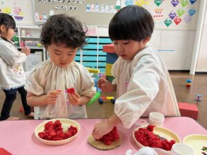 3歳児桜組のリズム遊びでは、桜紙1枚を手のひらで丸め、イチゴの形の段ボールにのりで貼った「いちご」を小道具として使用します。「あまーいいちご、でーきた。」と教師の声が聞こえると「私も作りたい!○○ちゃん、一緒に作ろう。」と、意欲を示し、友達を誘い合う姿が見られました。「このくらいで足りるかな?」「いや、まだまだだよ。」と完成形をイメージしながら、隙間が無いようにのりを塗ったり、丸い形を表現するためたくさんの桜紙を丸め、園児が作った小道具『いちご』が”完成しました。「いちごを少しくださいな。」「どうぞどうぞ、召し上がれ。」と、リズムあそびのセリフを言いながら、自分たちで作った『いちご』を使って遊ぶ様子も見られました。