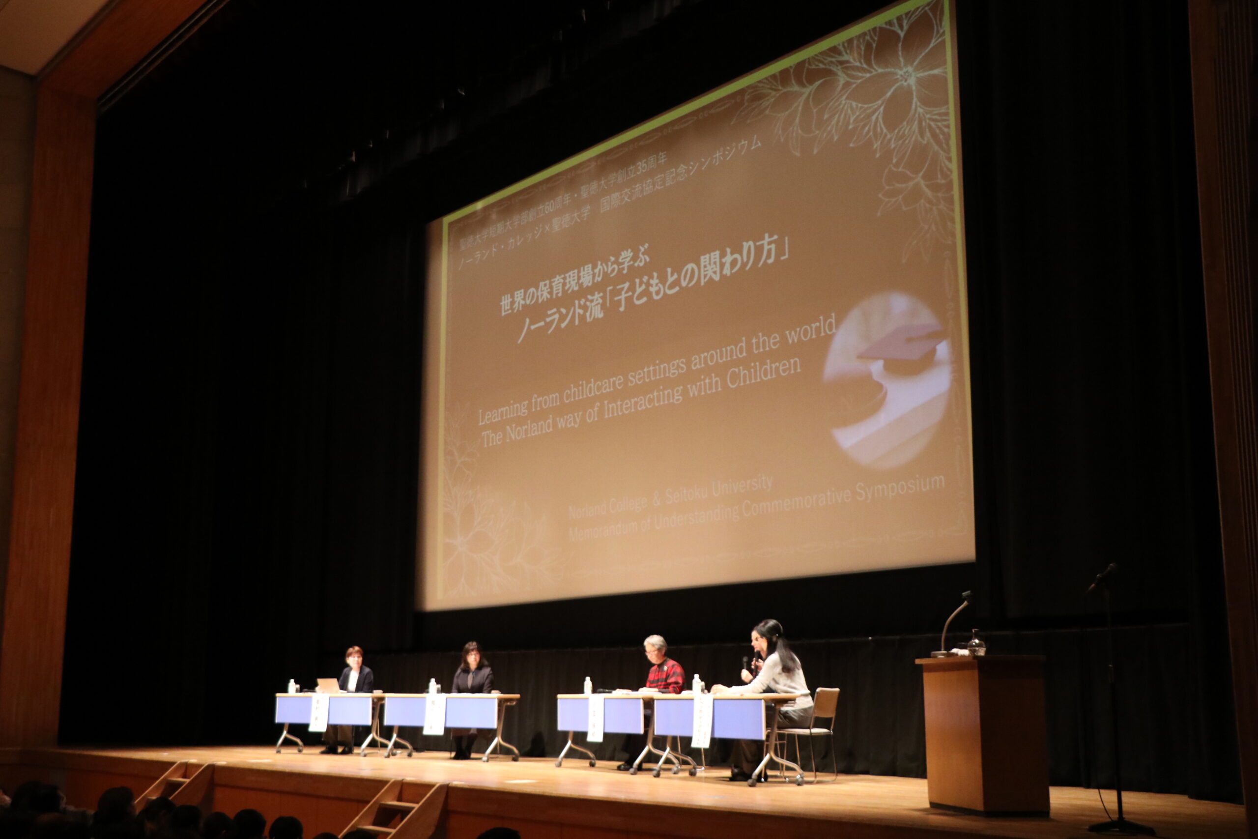 12月8日(月)英国ノーランドカレッジから先生をお招きし、「世界の保育現場から学ぶ ノーランド流 子どもとの関わり方」をテーマにしたシンポジウムが聖徳大学川並香順記念講堂にて開催されました。ノーランドカレッジと本学とは、20年以上にわたり学生交流を行ってきましたが、このたび包括協定を結び、学生交流だけでなく、教育・研究分野においてもさらに連携を深めていくことになりました。