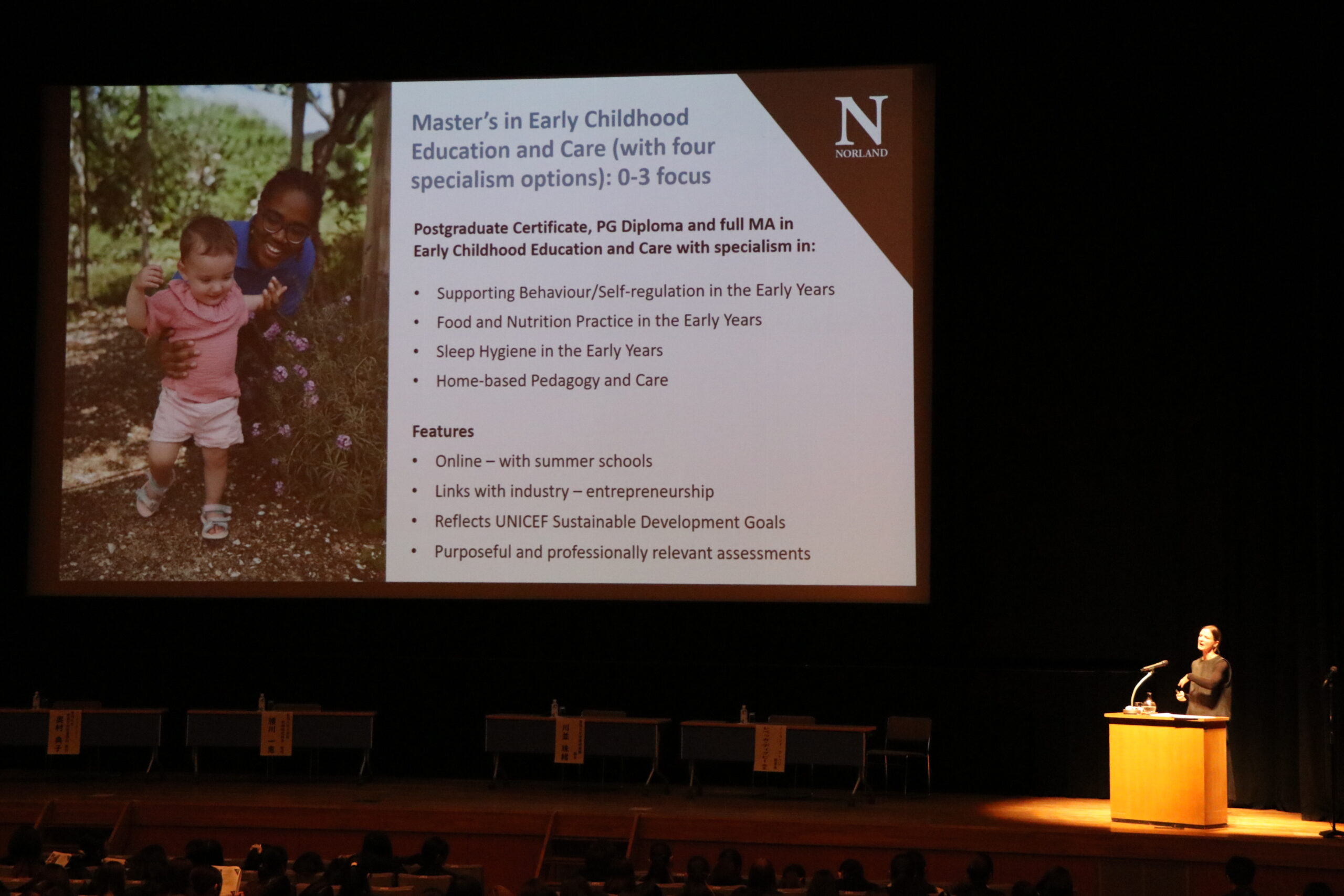 まずは、ノーランドカレッジ副学長のレベッカ・ディグビー先生から、「ノーランドカレッジの保育理念と実践」という演題で基調講演をいただきました。ノーランドカレッジのカリキュラムで大事にしていることは、幼児教育の学術的知識だけでなく、それを実践する力と応用力を現場実習の中で身につけることだそうです。理論と実践が組み合わされたときに真の保育力が生まれるというノーランドカレッジの教育理念は、聖徳大学の教育理念にも通じるものがありました。