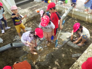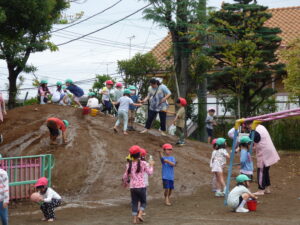 土遊び・砂遊びを通して、年長児は考え、試し、試行錯誤し、年中児はダイナミックに体を動かし、年少児や満三歳児は年長児や年中児の遊びに興味を示し、真似たり一緒に遊んだりするなど、年齢ごとの成長も見られます。また縦の繋がりも深まり、互いに刺激し合いながら遊んでいます。今後も、指先や全身を使い、泥の感触や水の変化(乾・湿・泥)を五感で楽しみ、創造力や集中力を養い、友達と協力したり、道具を共有したりすることで、社会性や協調性も育み、子ども達の「こうしたらどうなるかな?」という思いに丁寧に目を向け、「やってみたい!」が実現できる保育を心がけてまいります。