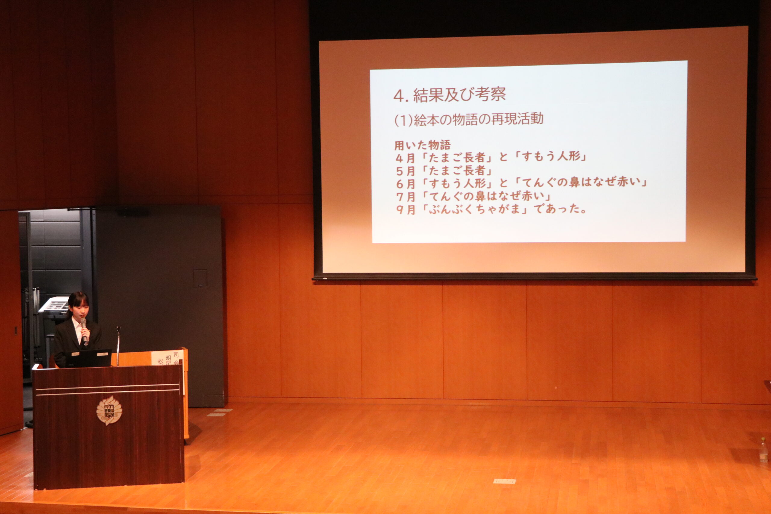 児童心理コースの学生は、「脳症後遺症のある小学校3年女児に対する絵本などを活用した言語表現への支援」をテーマに、障害のある子どもが園生活の中で安心して過ごすための支援の在り方について発表しました。子どもの特性理解や環境調整の工夫、保護者との連携の重要性など、実習経験を踏まえた具体的な提案が示され、聴衆から大きな関心が寄せられました。