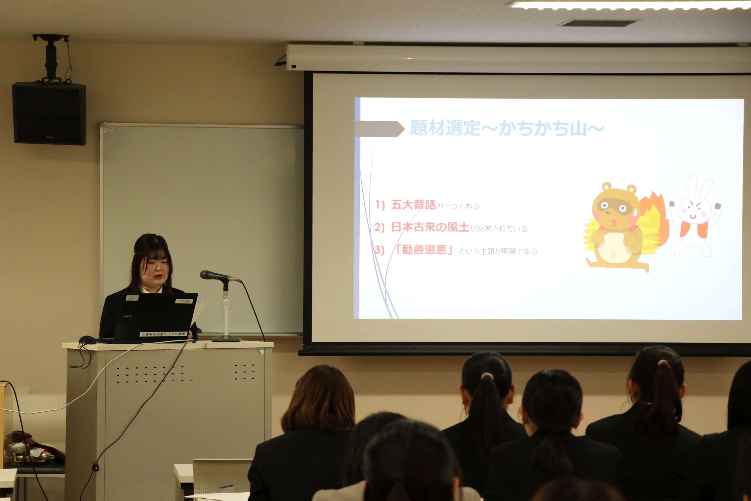 幼稚園教員養成コースの学生は、「昔話の伝承と子どもへの働きかけ -子どもとの相互作用に着目した人形劇制作- 」をテーマに、幼児期の遊びが育む主体性と協同性について考察しました。子ども同士の関わりを丁寧に観察した記録をもとに、保育者がどのように環境を整え、子どもの学びを支えていくかを分かりやすく示しました。