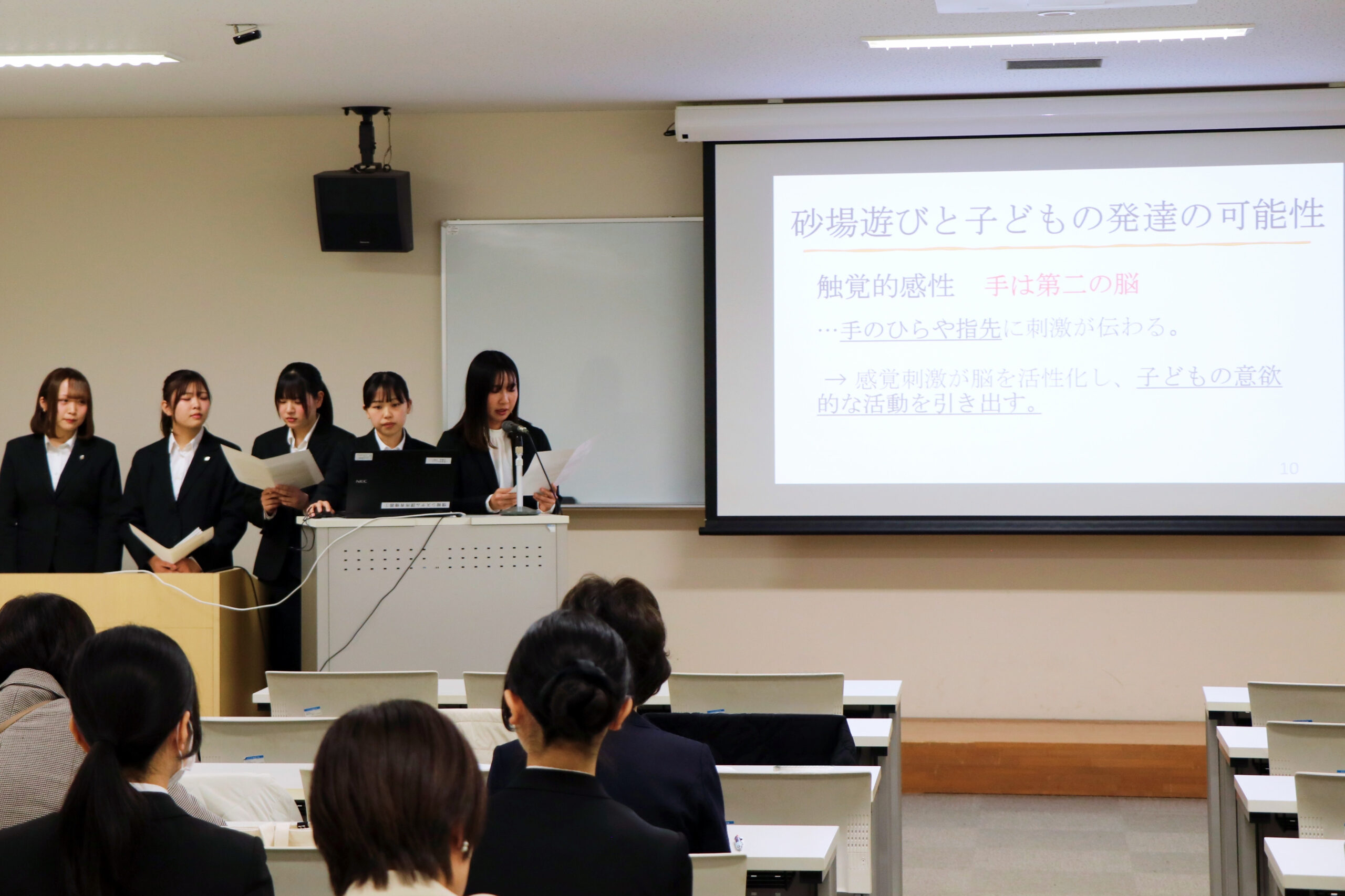 短期大学部保育科の学生たちはグループ発表で、「砂場遊びから得られる学び ~援助や工夫の在り方~ 」をテーマに、砂場遊びを通して育まれる力について発表しました。子ども・保護者・保育者の三者をつなぐ言葉かけや関係づくりの工夫を取り上げ、保育現場で働きながら夜間に学んでいる学生ならではの視点が光る内容となりました。