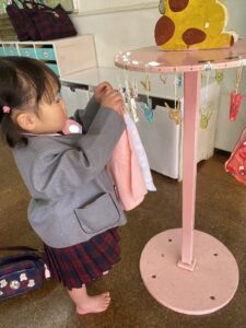 登園すると、所持品の始末をします。タオルをタオル掛けの洗濯バサミに挟みます。これは、手と目の協応作業で幼い園児にとって難しいことです。初めはできなくても、教師が援助し毎日の繰り返しでできるようになってきます。