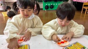 この日はクレパスを使ってアンパンマンの被り物やペンダントを作りました。「どんなお顔にしようかな?」と考え楽しみながら描く姿が見られました。