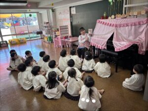 時間差で登園するバス通園の園児も含め全員集まると、片づけをし、トイレで排泄を済ませ、ピアノの前に座って歌ったり絵本を見たりします。涙が出てしまう園児も、ピアノの音や絵本を読む声があると自然と涙が止まり、落ち着き楽しむことができました。